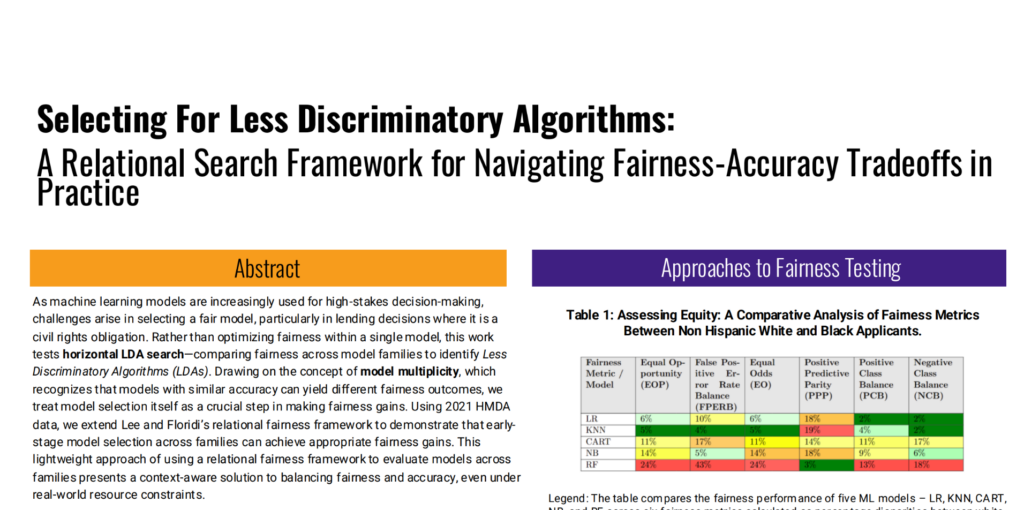 At the fifth ACM Conference on Equity and Access in Algorithms, Mechanisms, and Optimization (EAAMO’25) in Pittsburgh, RAIL presented two research posters. One poster presented findings from the 2025 research paper “Selecting for Less Discriminatory Algorithms: A Relational Search Framework for Navigating Fairness-Accuracy Trade-offs in Practice”. The paper tests a fairness approach, termed horizontal LDA search, comparing fairness across model families to identify Less Discriminatory Algorithms (LDAs), which are in many cases a civil rights obligation. The lightweight approach tested in the paper presents a context-aware solution to balancing fairness and accuracy, even under real-world resource constraints.
