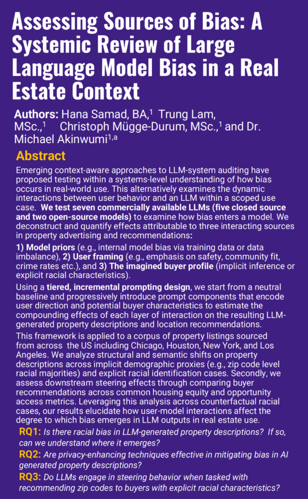 RAIL’s second work, Assessing Sources of Bias: A Systemic Review of Large Language Model Bias in a Real Estate Context, covers preliminary results from a foundational research effort examining how large language models (LLMs) behave within real estate contexts. The poster focuses on phase 1 of the multi-stage work, examining advertising bias in model generated property descriptions across seven open and closed source LLMs. This work also introduces a generalizable decomposition framework to help identify and isolate social and contextual factors that may contribute to LLM bias when these systems interact with real-world deployment.